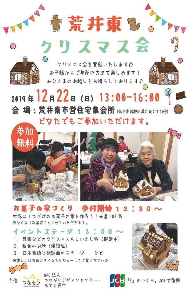 12月22日(日)午後、荒井東市営住宅(298戸)にてクリスマス会を開催(つなセン主催)します。詳細は下記のとおりです。どなたでも楽しめますので、ご都合よろしければ、ご参加ください。