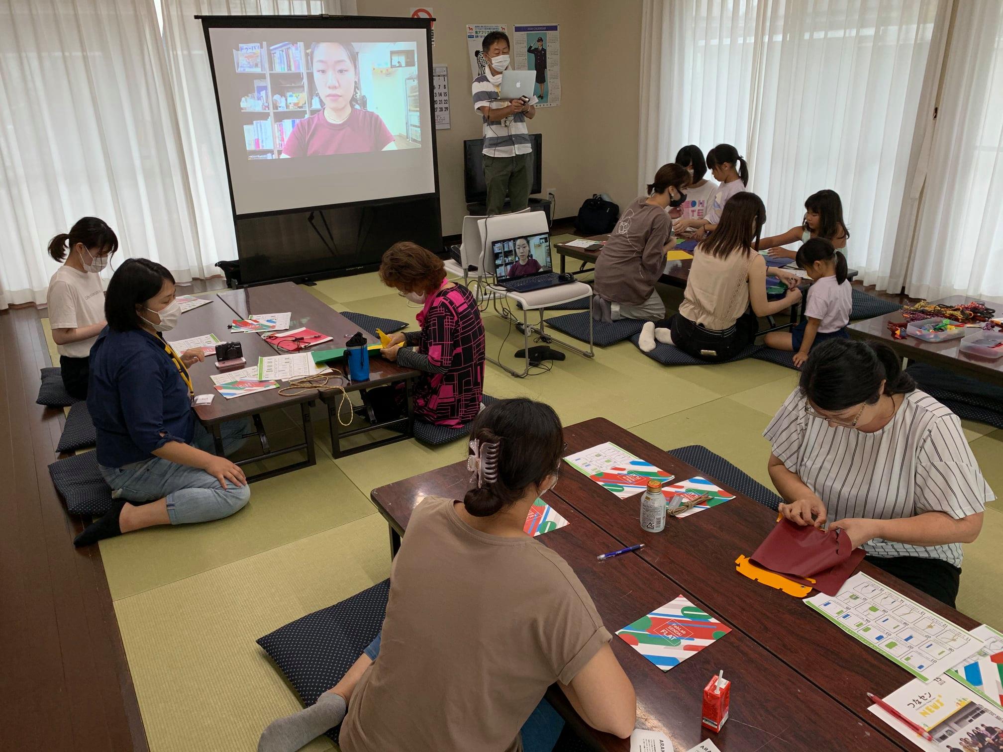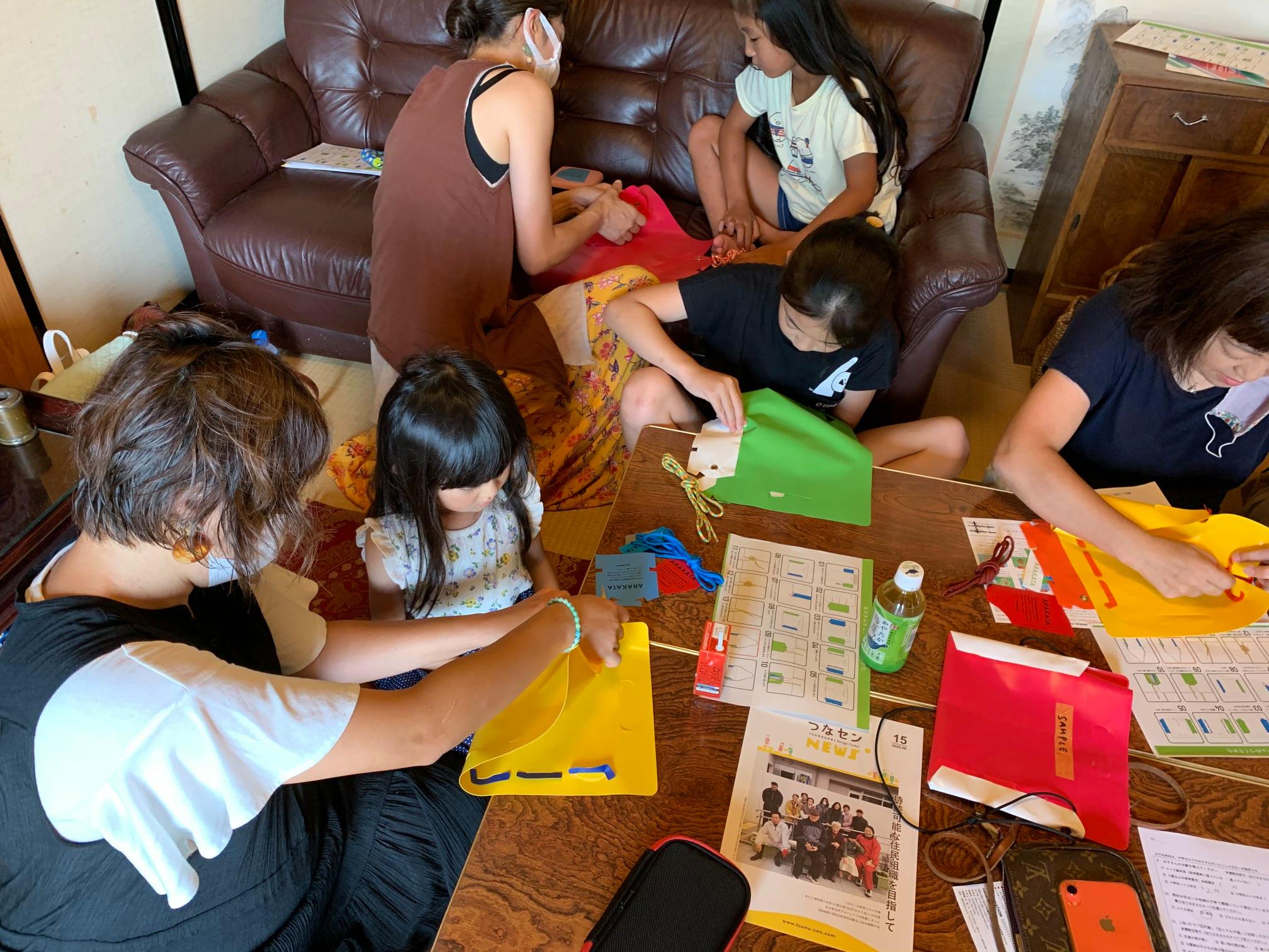 参加者は2か所で14組の親子27名が参加し、色とりどりの部材から好きな色の組み合わせを選び、リモートで参加した講師のアドバイスにより、大人も子供も楽しく作成されていました。